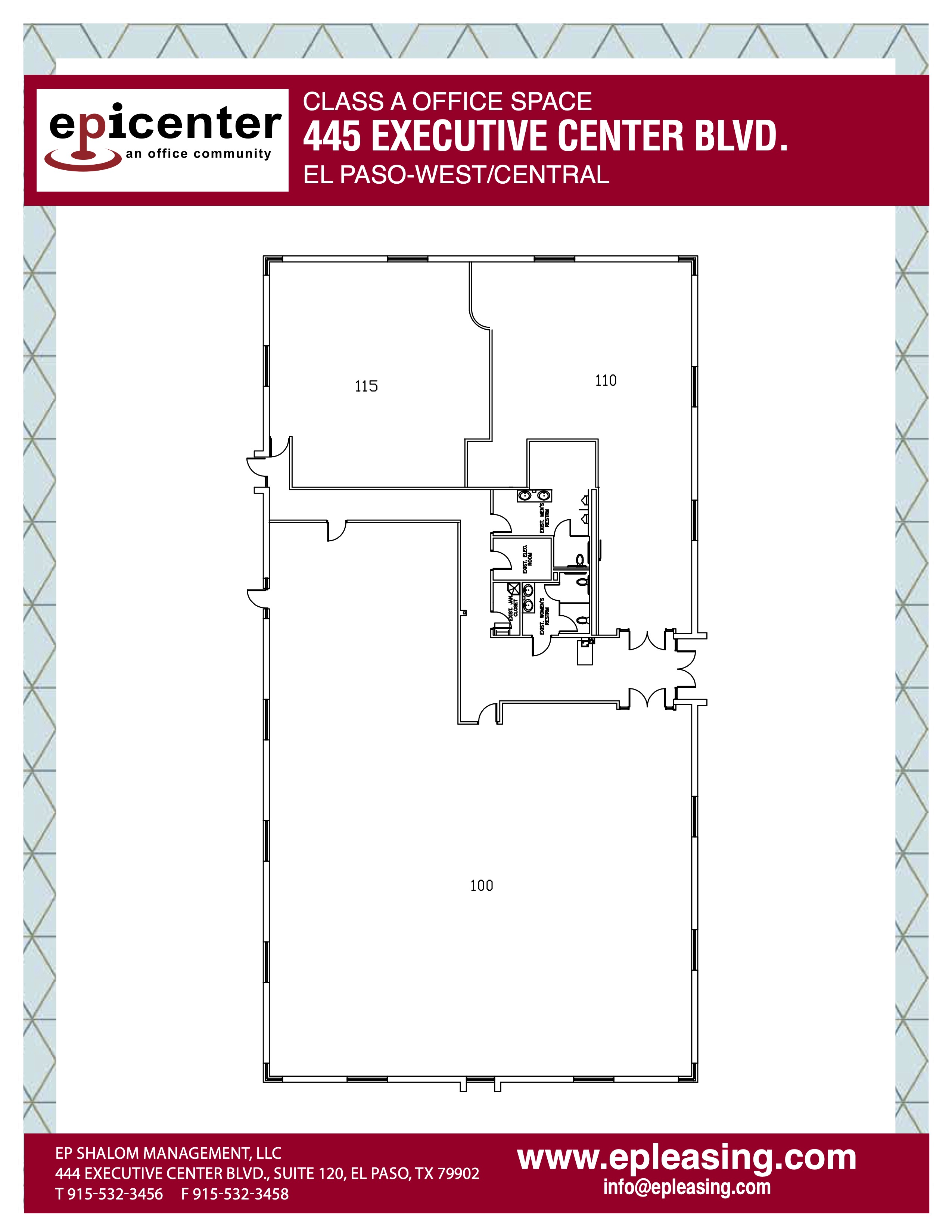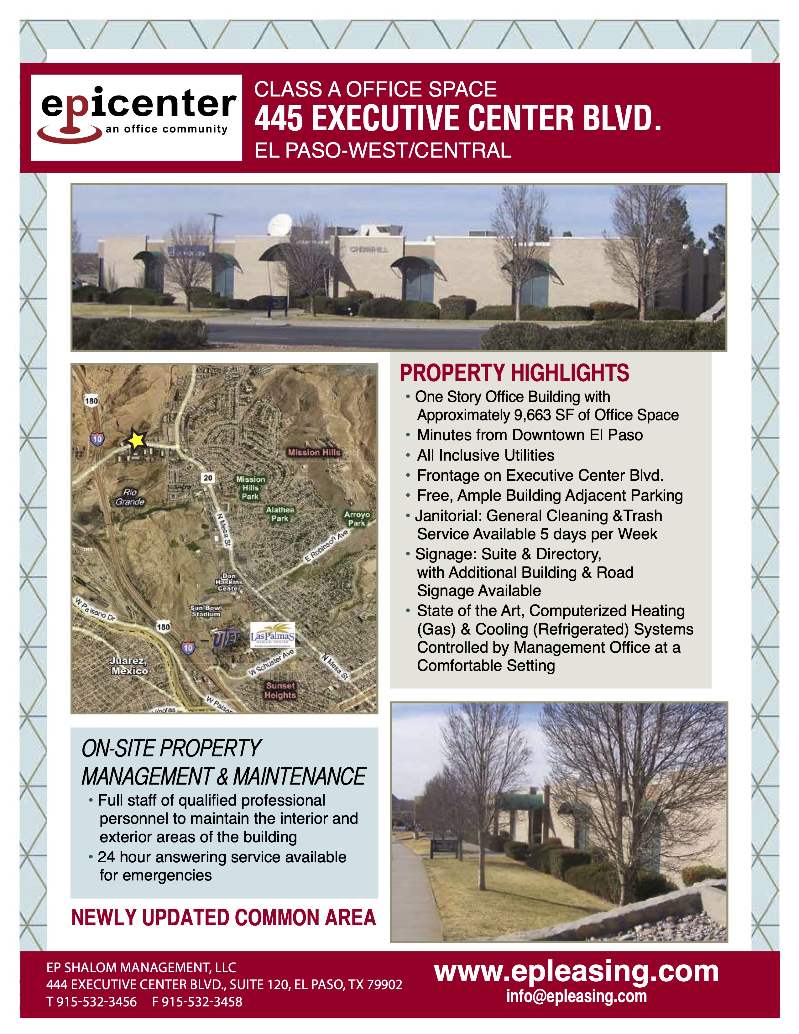 This modern, one-story office building offers approximately 9,663 SF of office space comprised of three interior suites, conveniently located minutes from Downtown El Paso with prime frontage on Executive Center Blvd. Tenants enjoy all-inclusive utilities, ample free adjacent parking, professional janitorial service five days a week, flexible signage opportunities, and state-of-the-art, management-controlled heating and cooling for a consistently comfortable work environment.