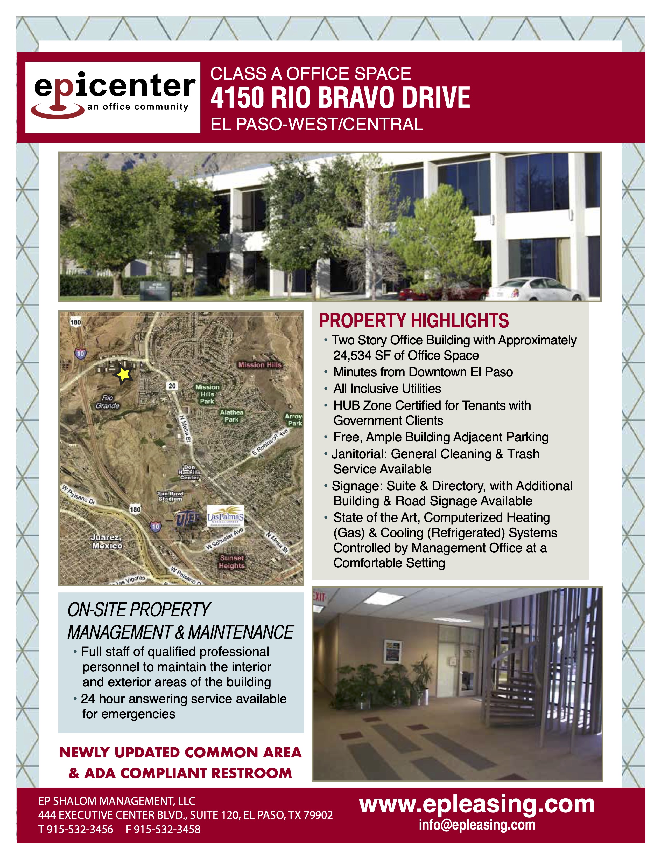 4150 Rio Bravo Drive anchors Epicenter, El Paso’s largest and most prestigious suburban business park. This 25-acre professionally landscaped campus comprises 17 Class A office buildings, all managed to institutional standards that attract national, regional, and local tenants.