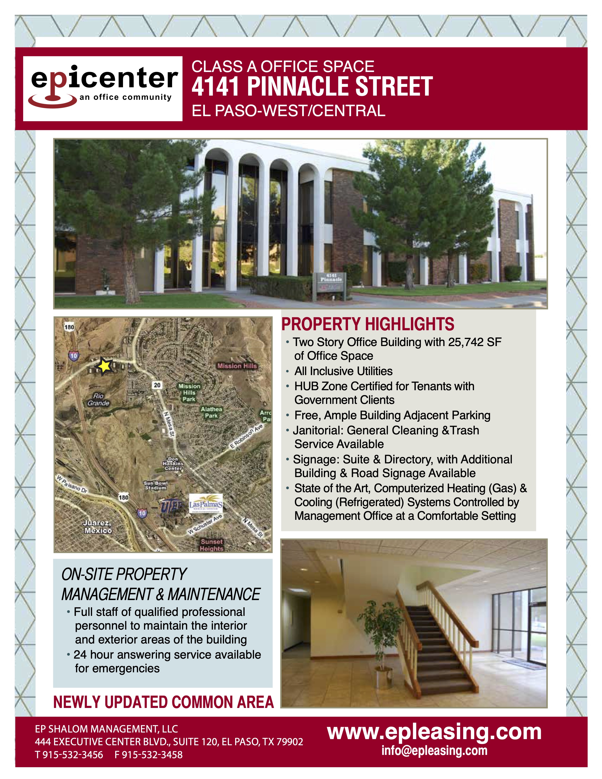 Discover versatile Class A office space at 4141 Pinnacle Street, part of the prestigious Epicenter office complex—El Paso’s largest and most distinguished suburban business park.